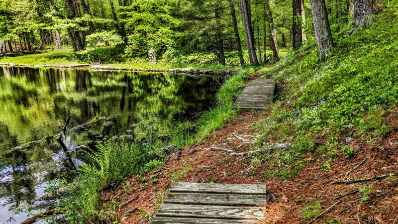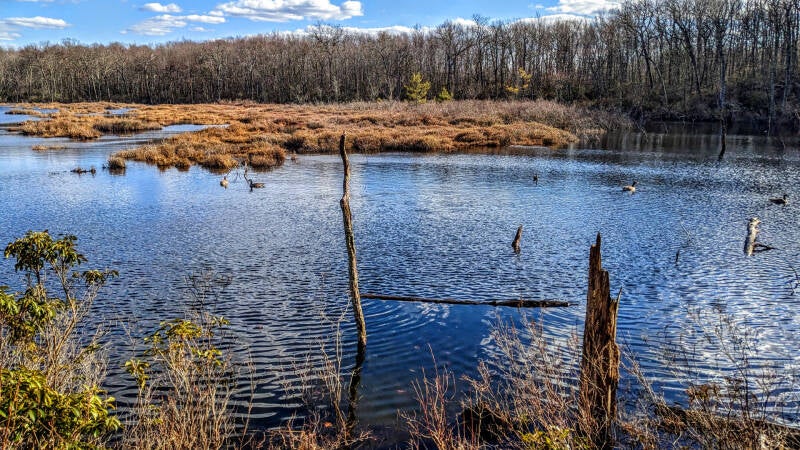 Tall trees, marsh, inlet stream and Herron Pond, White Memorial Foundation, Morris, Connecticut. June 13, 2024, 12:54 PM.