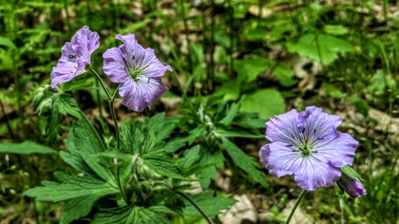 Wild geraniums on the forest floor near Beaver Pond, Morris, Connecticut. May 17, 2024, 2:03 PM.