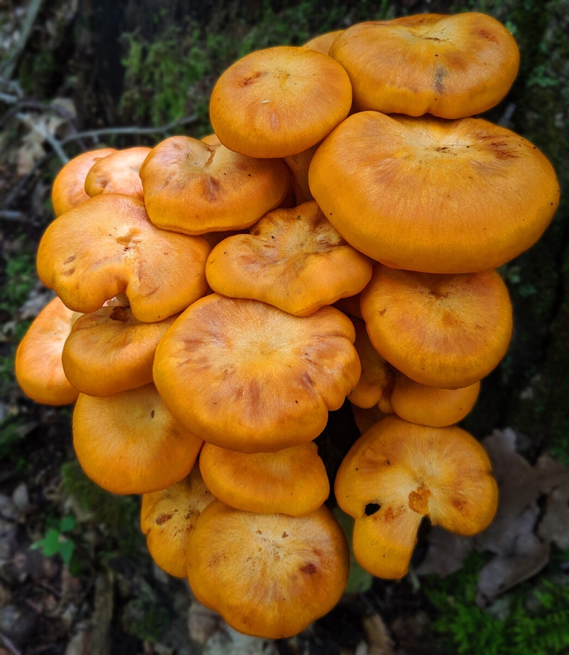 Eastern jack-o'lantern mushrooms, Woodtick Trail, Wolcott, Connecticut. September 7, 2019, 3:21 PM.