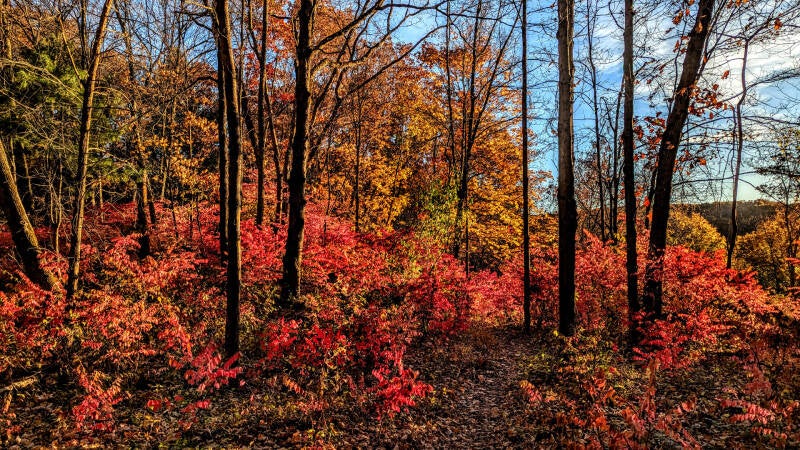 Evening ridge walk through a burning bush thicket, Sleeping Giant State Park, Hamden, Connecticut. October 25, 2024, 5:06 PM.