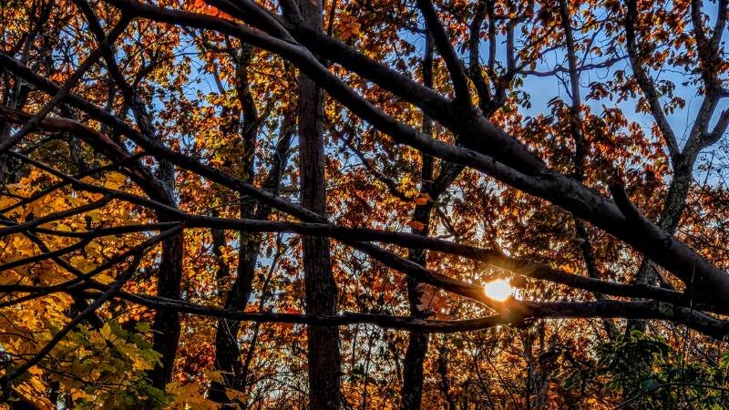 Hazy ball of golden fire November sunset, Giant's Chest. Sleeping Giant State Park, Hamden, Connecticut. November 10, 2022, 4:03 PM.