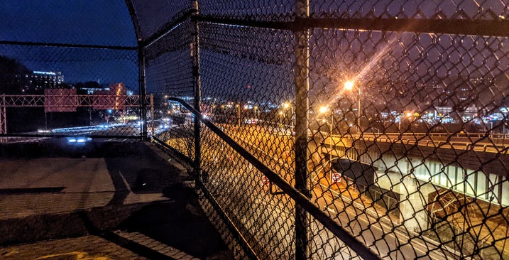 A change of pace. Night view through a chain link fence. Walking across a concrete footbridge over a highway interchange in downtown Waterbury, Connecticut. Footbridge over the I-84 / CT 8 highway junction, March 10, 2022, 6:39 PM.