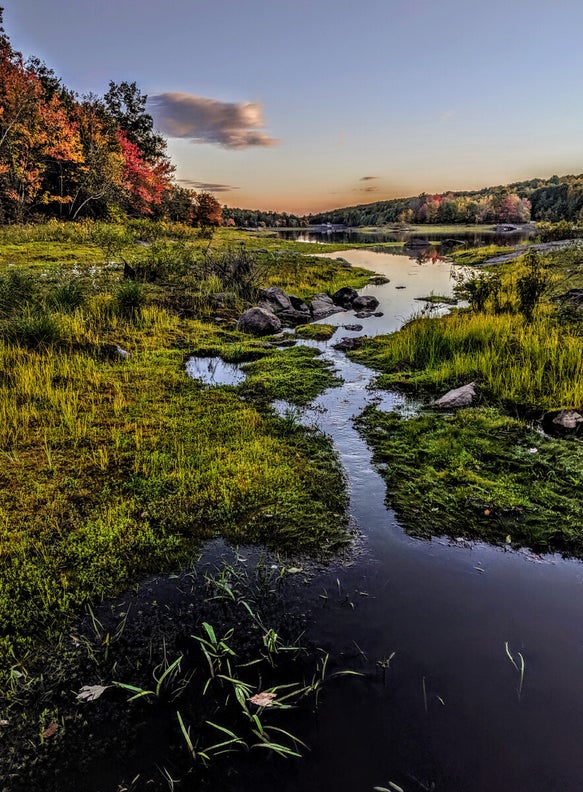 The magic of October at the reservoir. New Britain Reservoir, Wolcott, Connecticut. October 12, 2019, 6:00 PM. The marsh surrounding the feeder stream is still vivid green, the maples at the edge of the forest provide a blaze of colors.