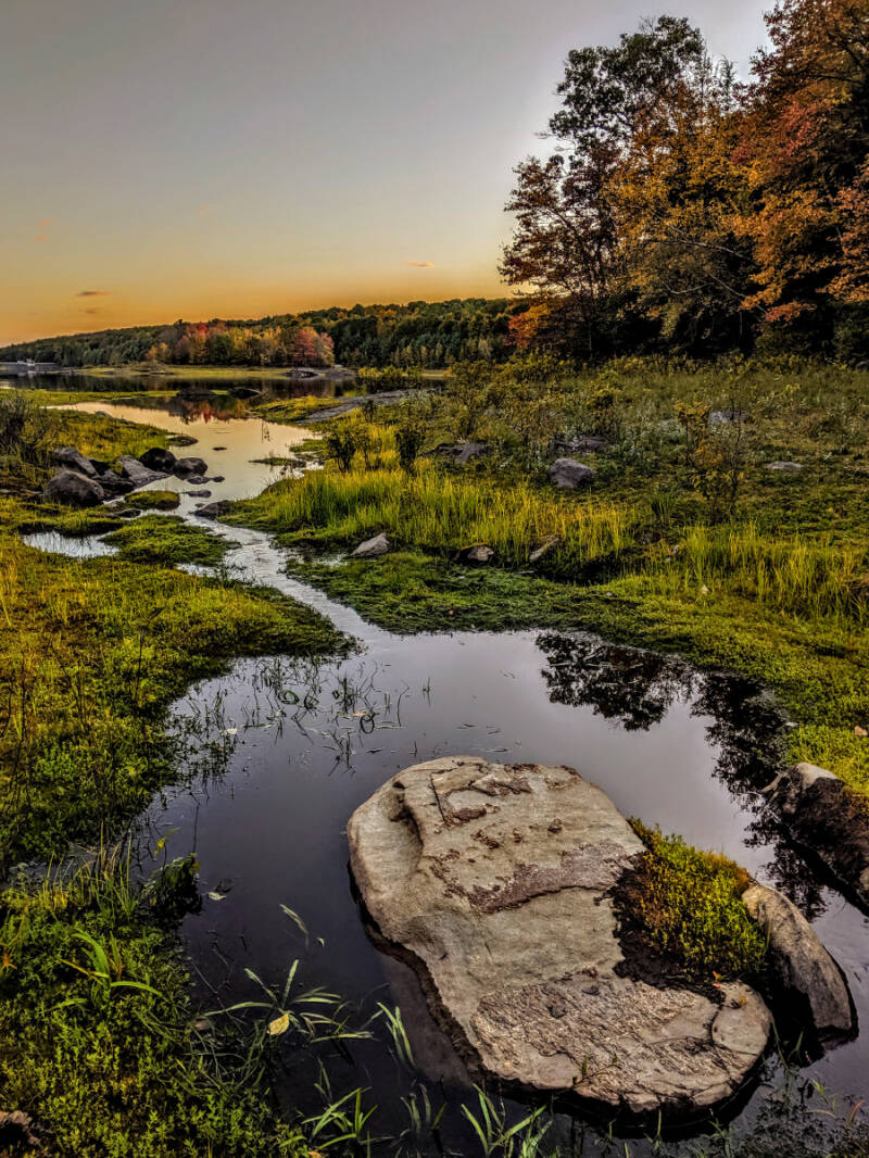 Rocky marsh in autumn, New Britain Reservoir, Wolcott, Connecticut. October 12, 2019, 6:00 PM.