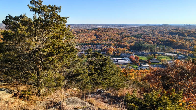 Quinnipiac University, Mount Carmel and New Haven from Giant's Chest, Sleeping Giant State Park, Hamden, Connecticut. October 27, 2022, 4:32 PM.