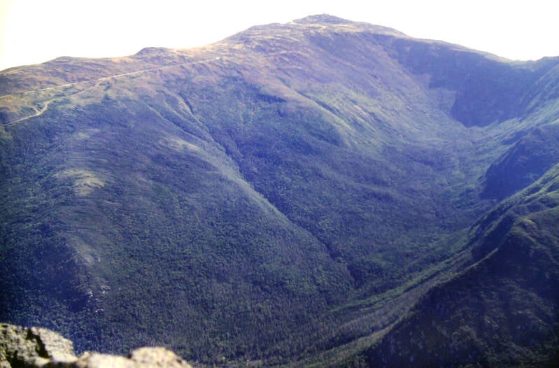 Soon, the Airline crossed the Appalachian Trail, and I turned back onto it. Looking back a little later at the impressive sweep of virtually barren rock between Adams and Quincy Adams, you could see why the AT bypassed it. There is a lot of dangerous weather on Adams. Bypass complete, the AT reclaimed the ridgeline, descending towards the bottom of the deep col between Adams and Madison, the site of Madison Spring Hut.