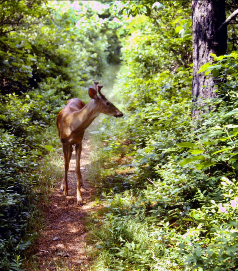 I saw five or six white-tailed deer along the trail July 3, from extremely close range. Like their cousins in the Great Smoky Mountains National Park, they seemed to harbor no fear of man. They would come strolling down the trail, allowing me to approach within thirty feet (or less, see right) of them before taking a few steps off of the path into the woods, where they would stand patiently waiting for me to pass by. They always watched carefully and seemed ready to bolt at the first sign of trouble, but it was still a valorous display for deer. I was touched and honored by their trust in me, and the venison tasted great that night.
