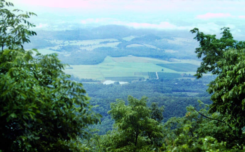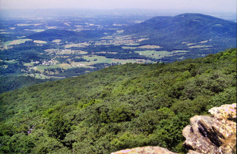 A short spur trail to the left led to some giant boulders just above the Hogback Overlook on Skyline Drive where a magnificent view unfolded: miles of the Page Valley, culminating at the northern end of Massanutten Mountain, where the severed halves of the Shenandoah Valley were reunited into one sprawling agricultural plain stretching forever toward the Alleghenies.