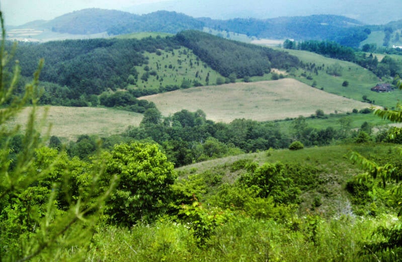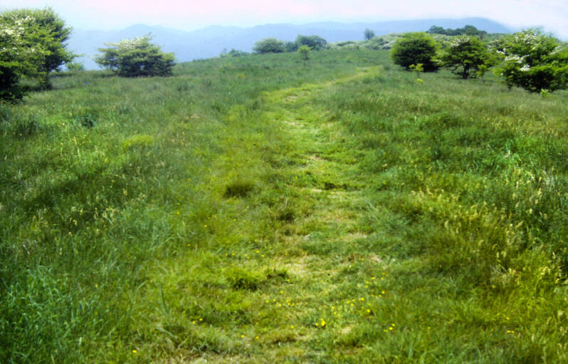 June 14, 1983 was another hot and an even more steamy day, but I managed to bang out 22 miles. After 7 miles of trudging up and down short, steep climbs at the start of the day, I had a long, steep climb up to and along Chestnut Ridge to Chestnut Knob. Both were nice. A long swathe of grassy, flowering meadow ran along the ridge crest up to and past the knob.